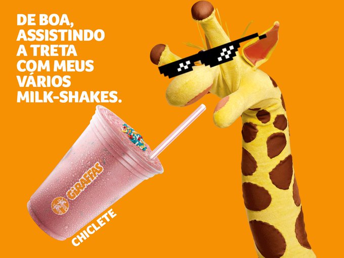 A brasileira Giraffas também abriu um espacinho para entrar na "briga". Postou um gif que mostrava vários sabores de milk-shake presentes em seu cardápio, com o comentário “De boa, assistindo a treta com meus vários Milk-Shakes."